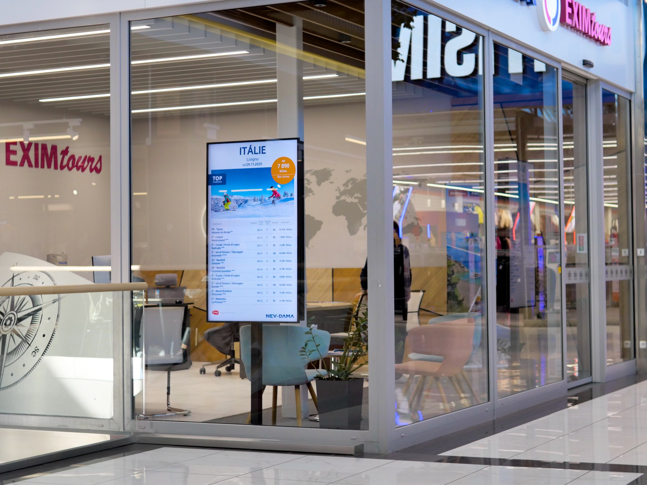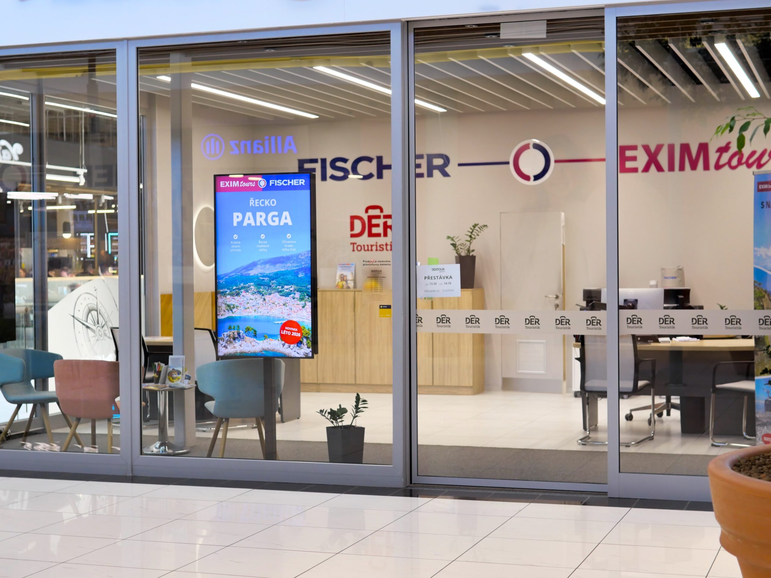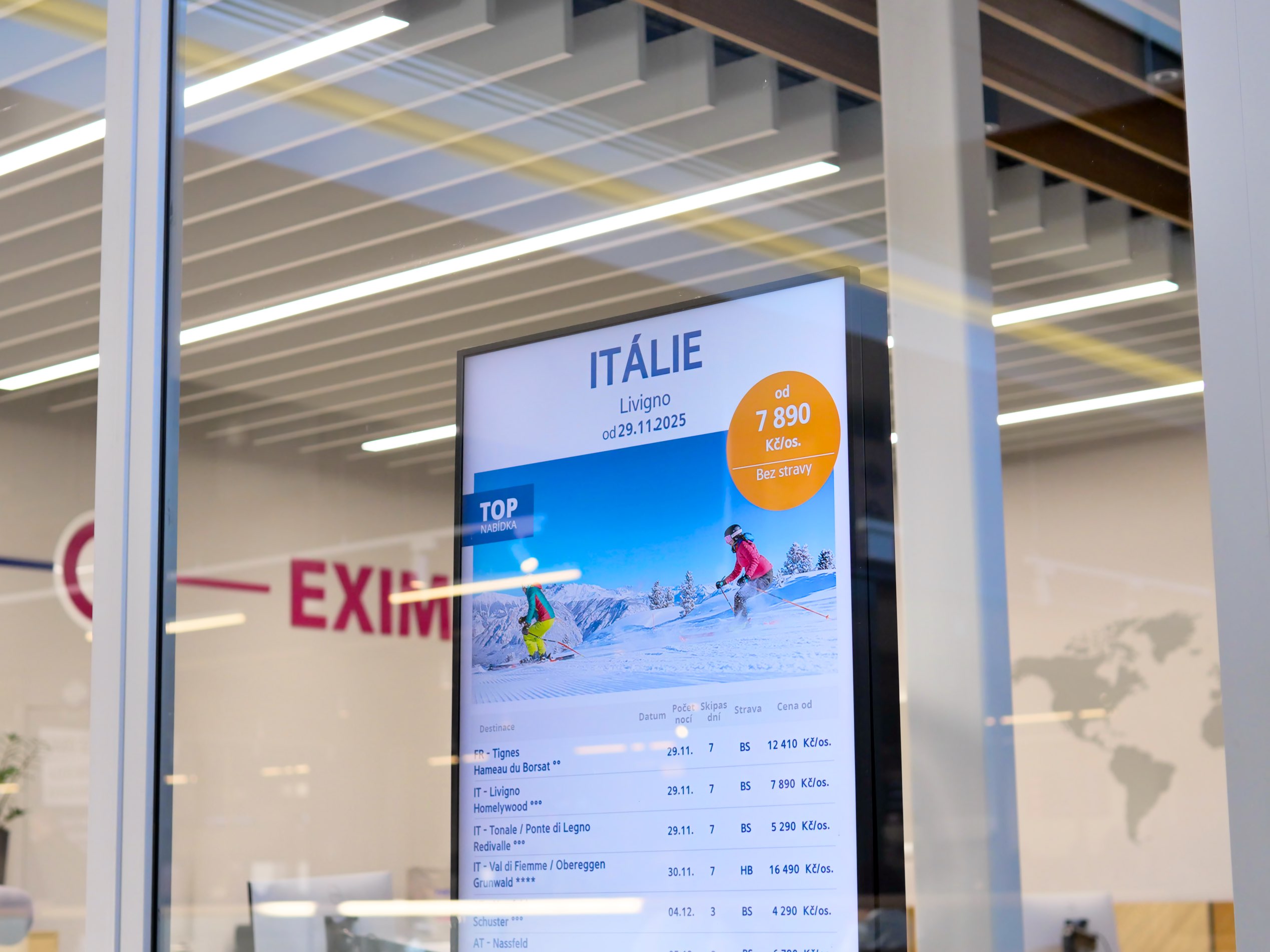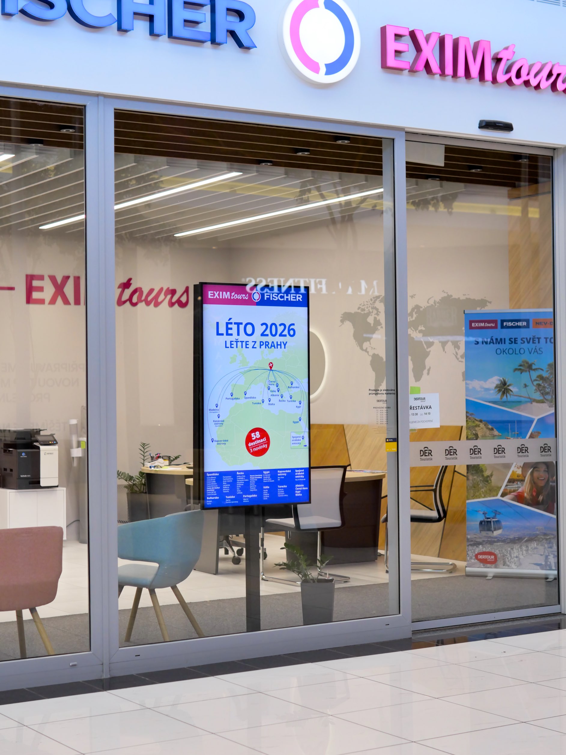 Do poboček cestovní kanceláře Exim Tours dodáváme naše LCD digital signage displeje. Ty jsou dle dispozicí dané pobočky instalovány různými způsoby. Na zdi, do výloh na stojany nebo na tyče ze stropu. Panely zobrazují jak běžné, tak akční reklamní nabídky. Celý projekt máme také pod naší vzdálenou správou a nad všemi zařízeními držíme neustálý dohled.