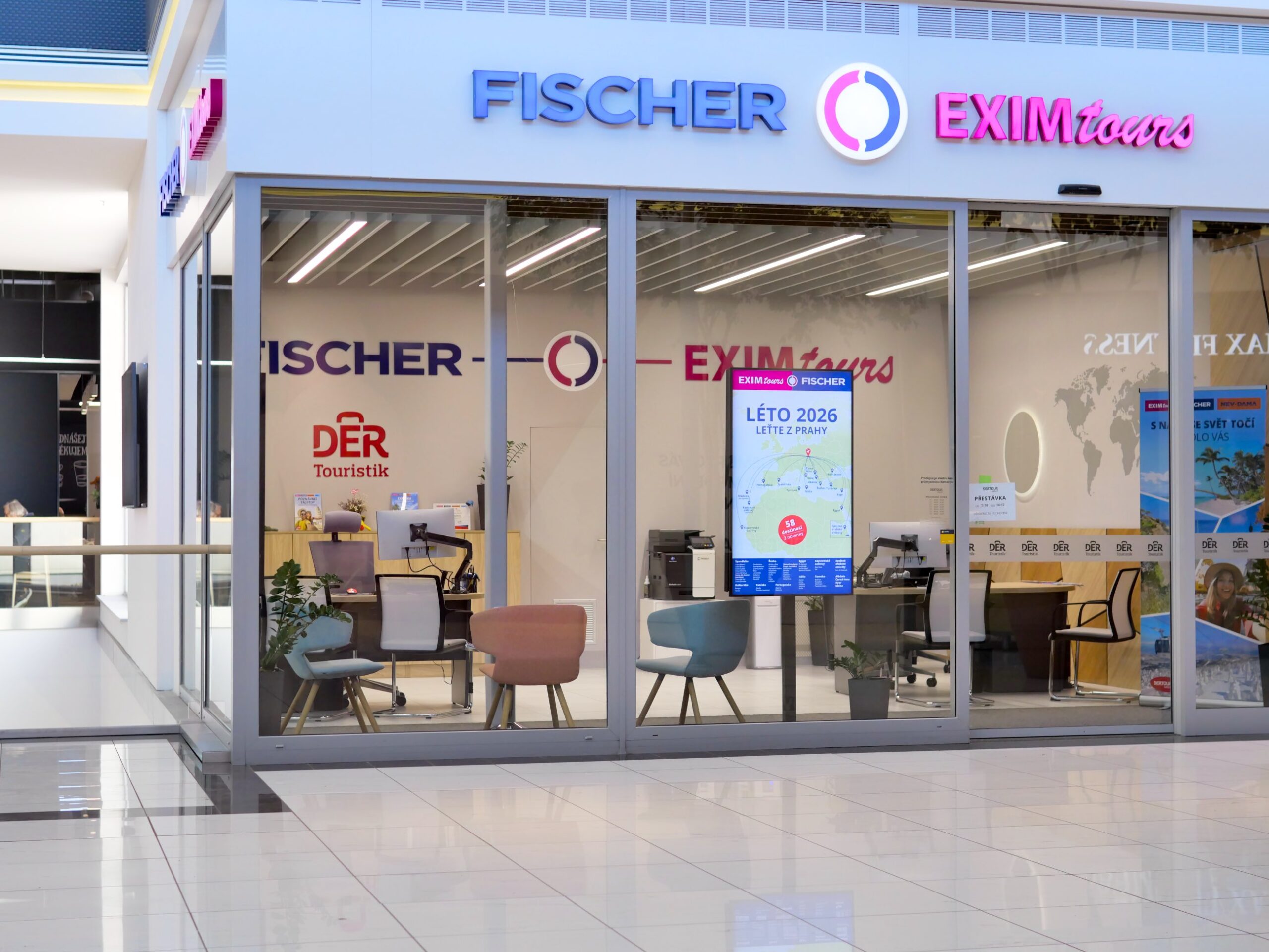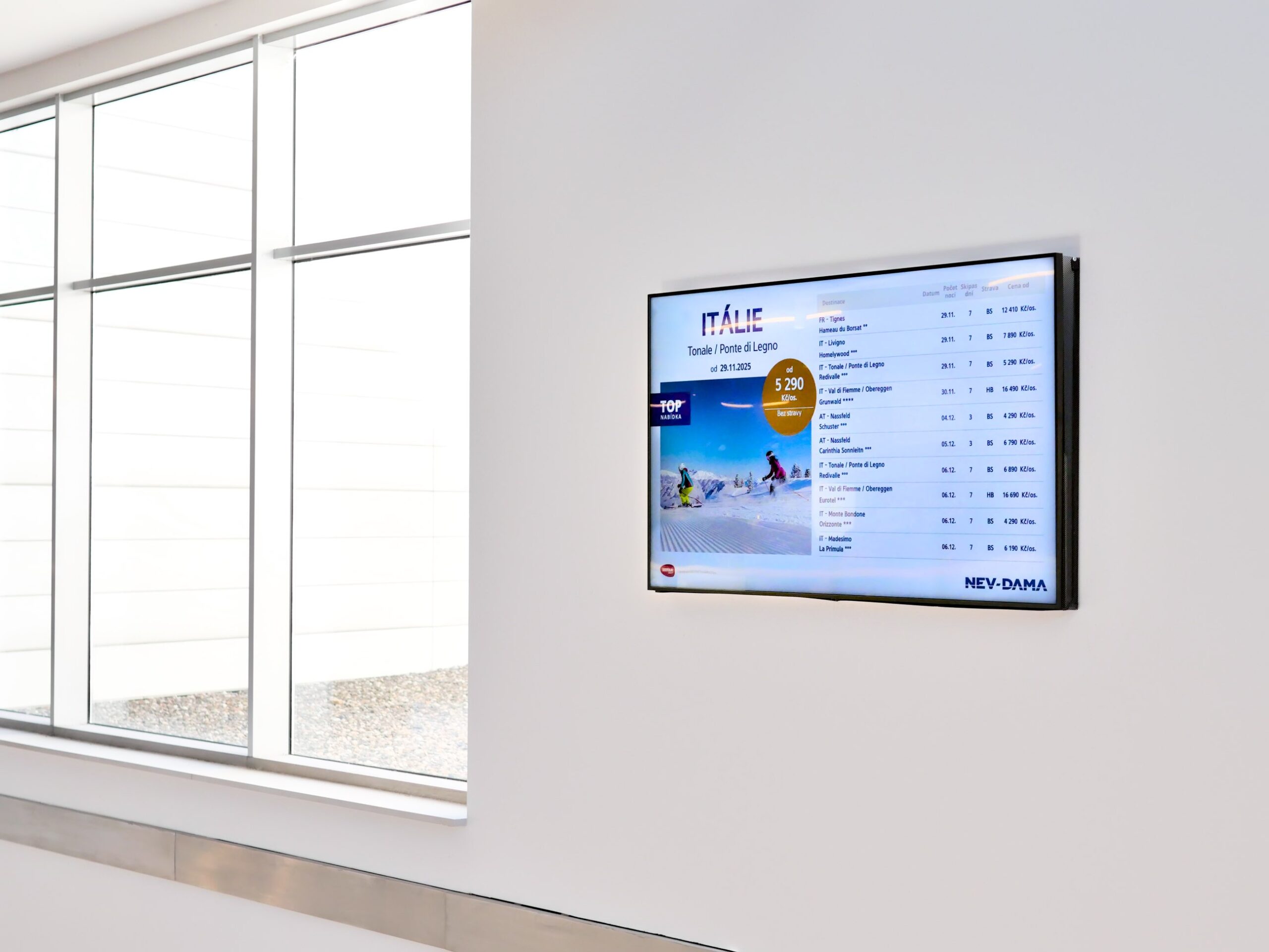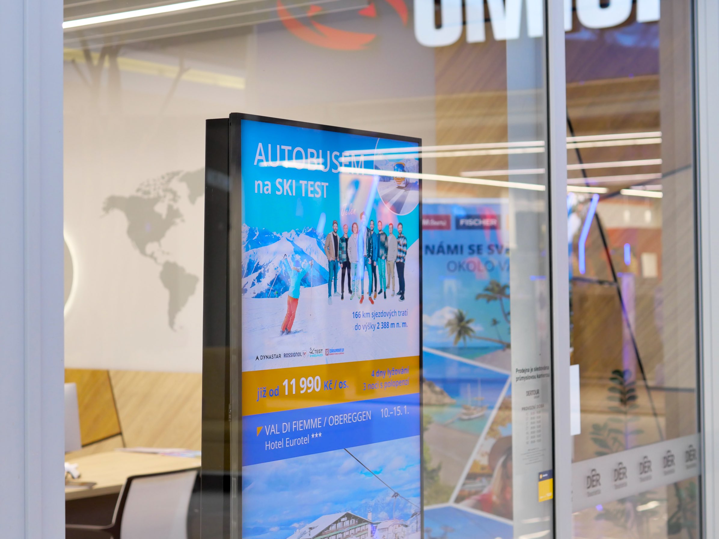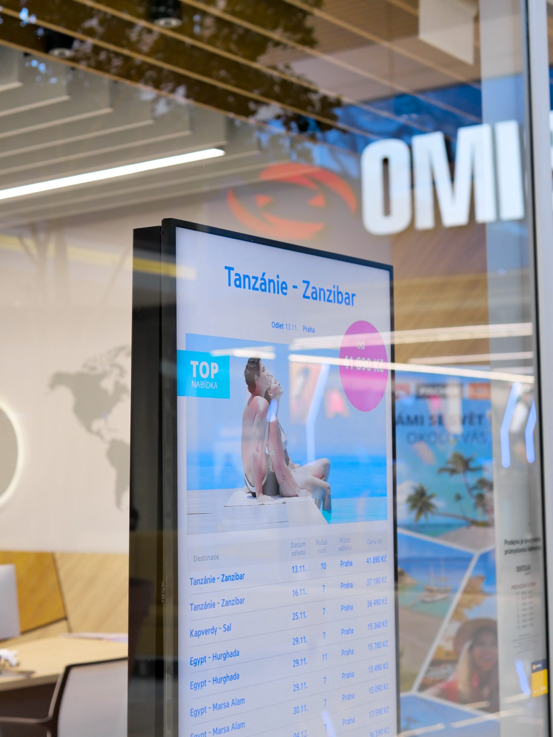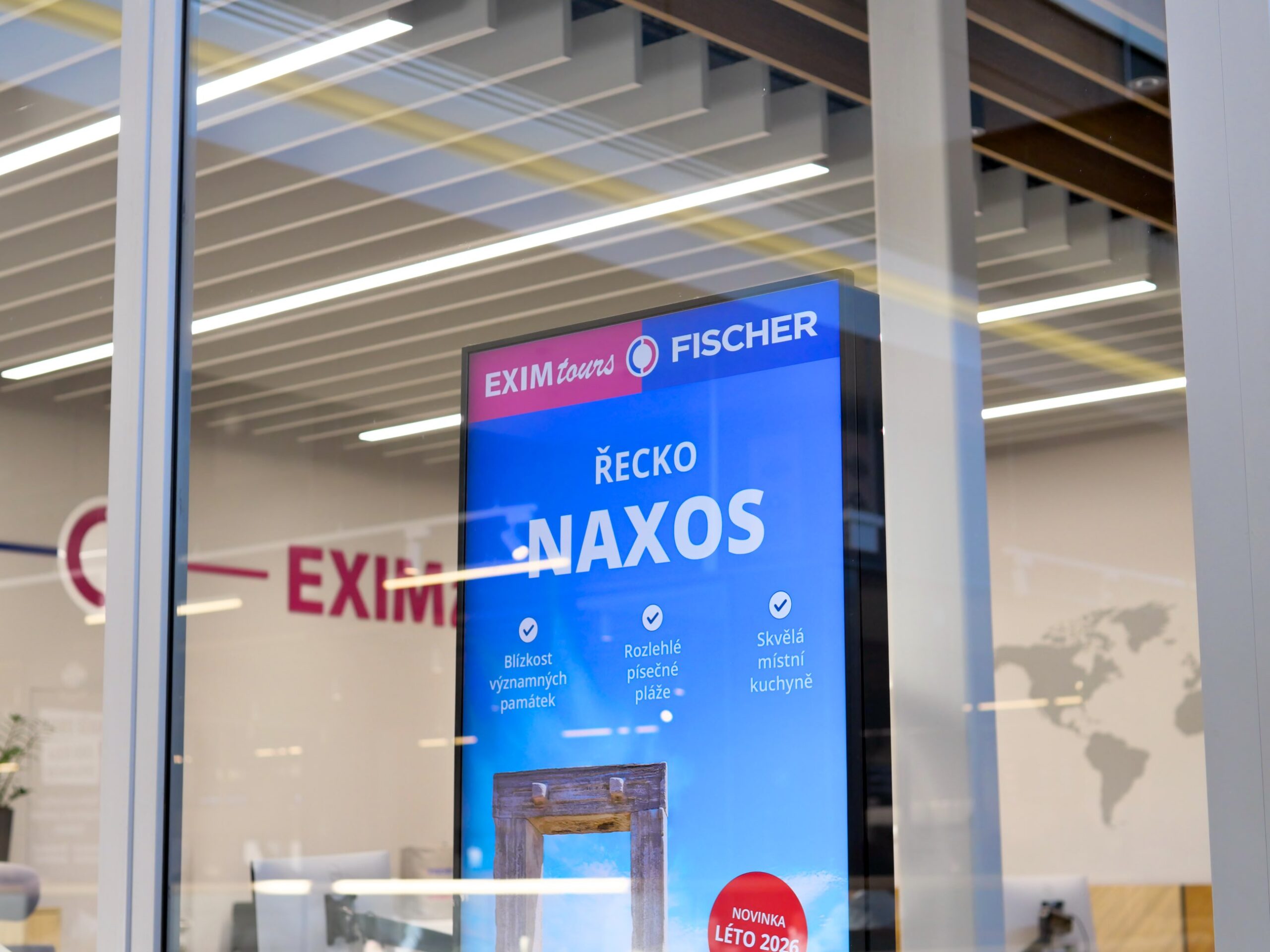 Do poboček cestovní kanceláře Exim Tours dodáváme naše LCD digital signage displeje. Ty jsou dle dispozicí dané pobočky instalovány různými způsoby. Na zdi, do výloh na stojany nebo na tyče ze stropu. Panely zobrazují jak běžné, tak akční reklamní nabídky. Celý projekt máme také pod naší vzdálenou správou a nad všemi zařízeními držíme neustálý dohled.
